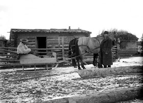 with bear skin and sleigh, ca. 1900. Spruce Grove, Alberta
